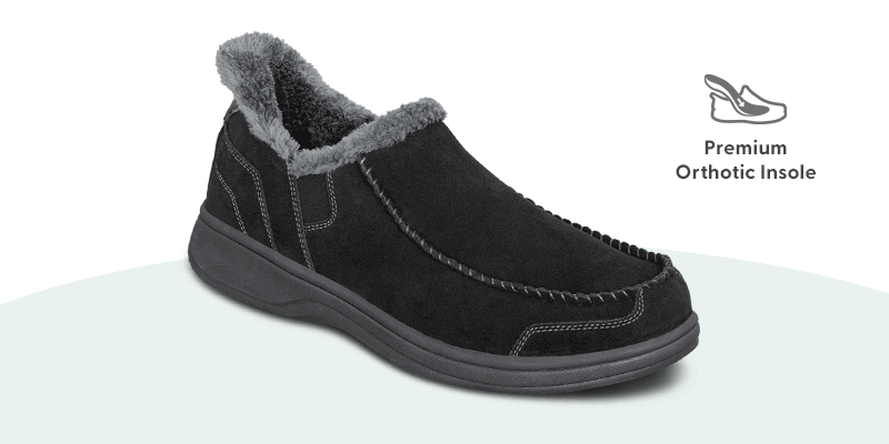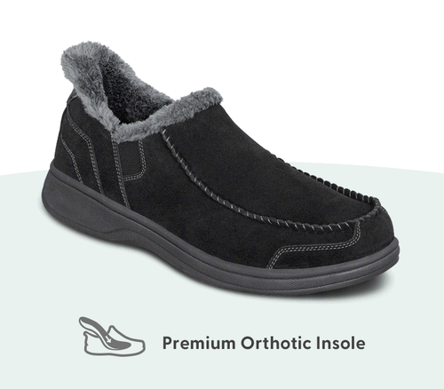 This tailored slipper-shoe offers full foot protection indoors and out. Put these on without bending down, thanks to our patented hands-free design. Lined completely in faux fur and featuring the supportive, easy-walking technology of the Ortho-Cushion™ System, Vito keeps your feet warm and well supported for more pain-free hours doing this and that, anywhere.