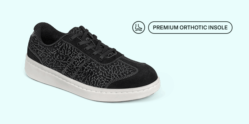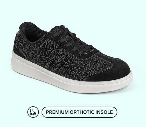 This up-to-date athleisure sneaker for women, in patterned suede leather, infuses classic sport styling with advanced therapeutic performance that addresses 20+ foot conditions. A padded interior with extra depth and wide toe box protects your mobility. With the bio-engineered support and comfort of the Ortho-Cushion™ System, it's game over for walking pain.